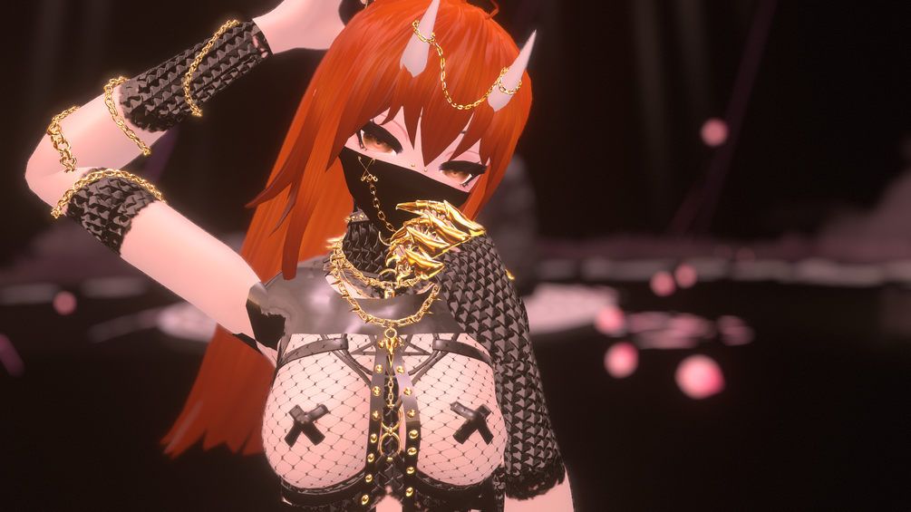 - Corset, Overshirt, Fishnet Shirt, Pasties, Harness & Garter, Arm Chain, Rings Facial Piercings, Finger Claws, Mask, Heels, Panties, Choker, Necklace, Arm Glove